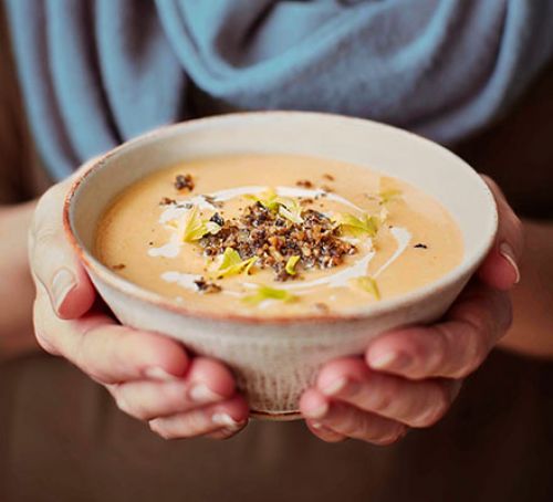 1. Melt the butter in a large saucepan over a medium heat. Add the coriander and the vegetables, fry for 4-5 mins, then cover with 400ml water and bring to the boil. Cook until all the vegetables are soft – around 20-25 mins.